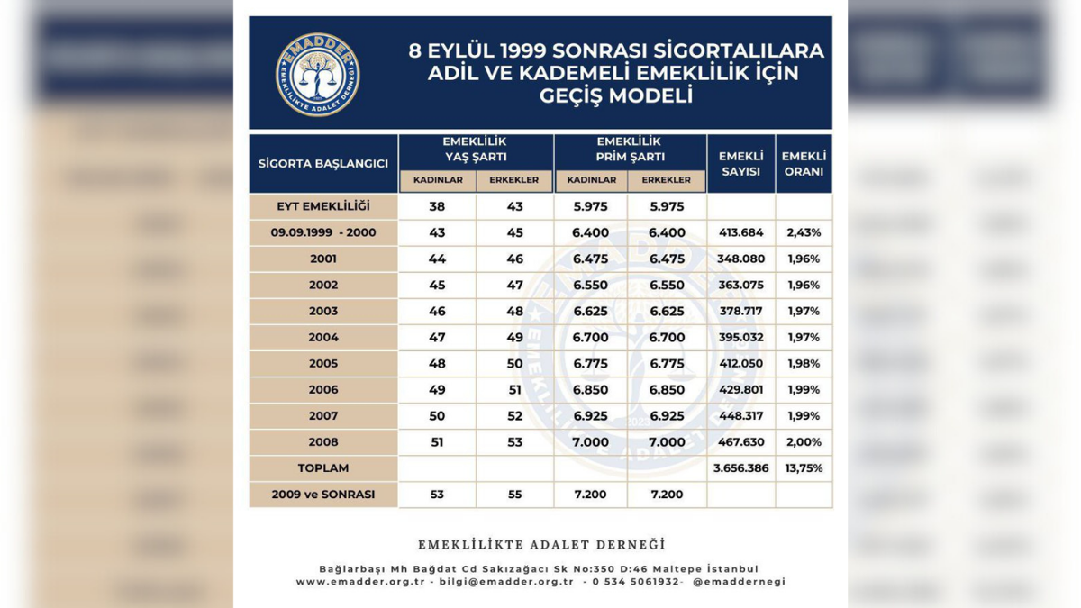 Dinçer'in paylaştığı ve EMADDER tarafından hazırlanan çözüm önerisi, 1999-2008 yılları arasında işe girenler için yumuşak bir geçiş öngörüyor. Önerilen modele göre: