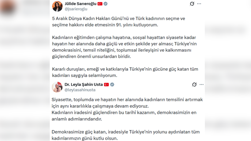 Türkiye, kadınlara seçme ve seçilme hakkının tanındığı 5 Aralık 1934 tarihli devrimin 91. yılını kutlarken, Ankara siyasetinin gündeminde vekillerin sosyal medya paylaşımları vardı. Başkent milletvekilleri bu tarihi günün anlam ve önemine dair mesajlar yayımladı ancak ortaya çıkan "üslup farkı" dikkatli gözlerden kaçmadı. Muhalefet kanadı, bu hakkın mimarı olarak Gazi Mustafa Kemal Atatürk'ü minnetle anarken; iktidar kanadından yapılan paylaşımlarda "demokrasi ve kazanım" vurgusu öne çıktı, ancak Atatürk'ün ismine yer verilmedi.