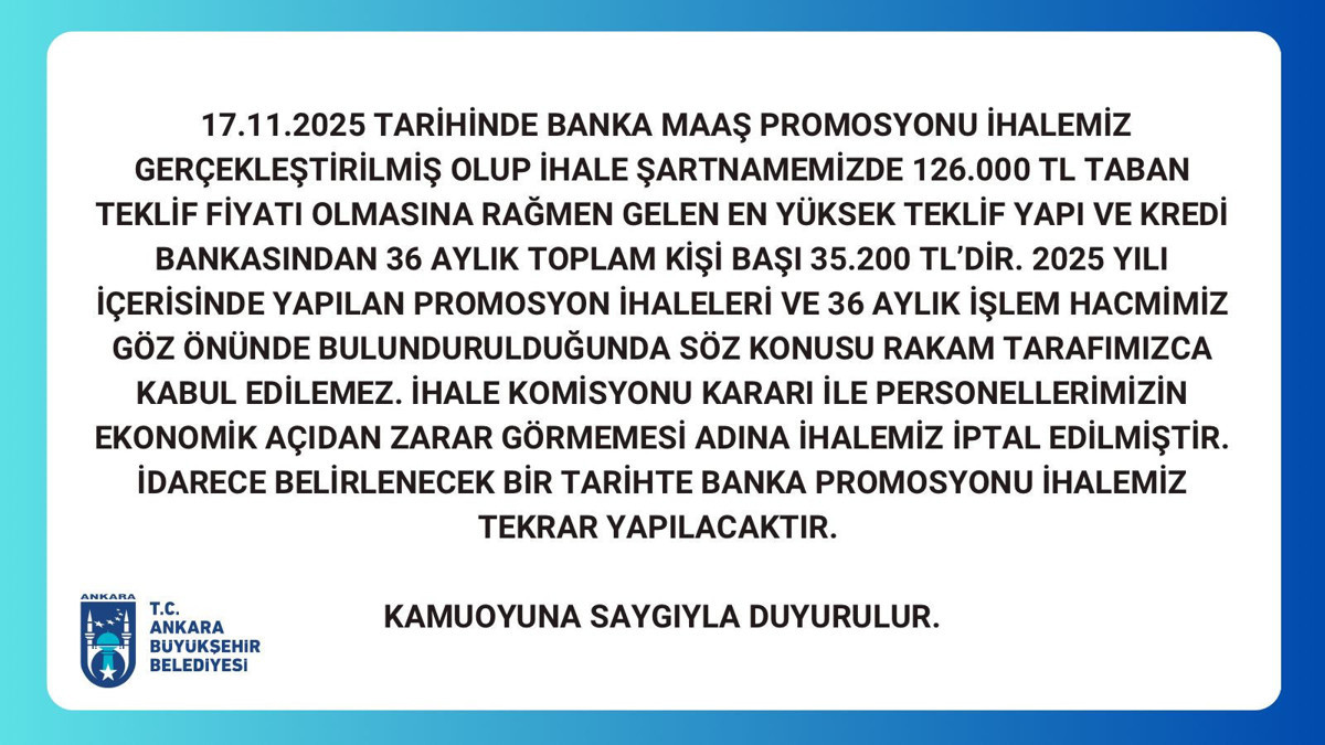 Ankara Büyükşehir Belediyesi, personelin haklarını koruma kararlılığında olduğunu belirterek, daha avantajlı bir teklif sağlanabilmesi için banka promosyonu ihalesinin idarece belirlenecek bir tarihte tekrar yapılacağını duyurdu.