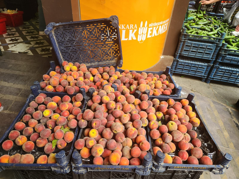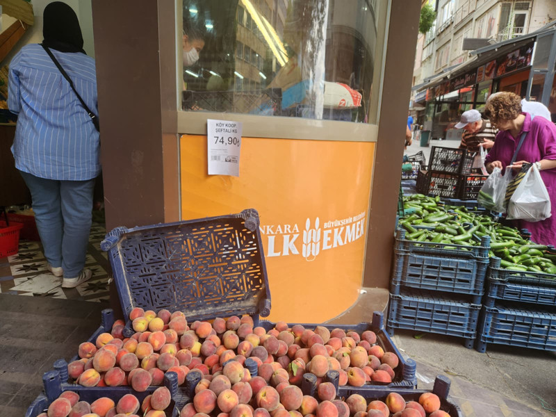 Ankara Büyükşehir Belediyesinin (ABB) Ankaralı vatandaşlara uygun fiyattan sebze ve meyve satışı yapılması için açtığı Halk Ekmek şubelerinde ise fiyatlar marketlere kıyasla daha uygun. ABB Halk Ekmek Mithatpaşa Fabrika Satış noktasında şeftalinin bir kilogramı 75 liradan satılıyor.