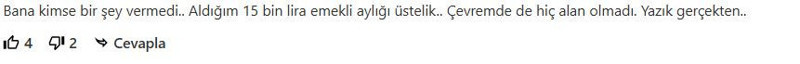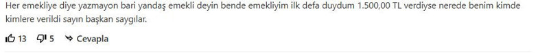 Bir emekli, “Her emekliye diye yazmayın bari, yandaş emekli deyin. Ben de emekliyim ama böyle bir yardımı ilk defa duydum. bin 500 TL verdiyse, nerede benim payım?” sözleriyle tepkisini dile getirdi.