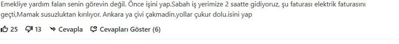 Bazı vatandaşlar yardımdan ziyade belediye hizmetlerinin eksikliğine dikkat çekti. Tepkilerden birinde, “Emekliye yardım senin görevin değil. Önce işini yap. Ankara’nın yolları çukur dolu, su kesintileri bitmiyor, ulaşım çileye döndü.” eleştirisi yer aldı.