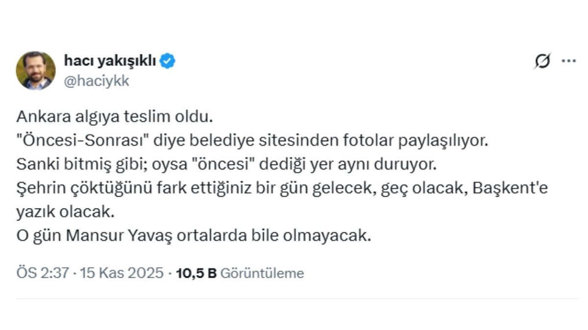 "Ankara algıya teslim oldu. Sanki bitmiş gibi; oysa 'öncesi' dediği yer aynı duruyor. Şehrin çöktüğünü fark ettiğiniz bir gün gelecek, geç olacak, başkente yazık olacak. O gün Mansur Yavaş ortalarda bile olmayacak."