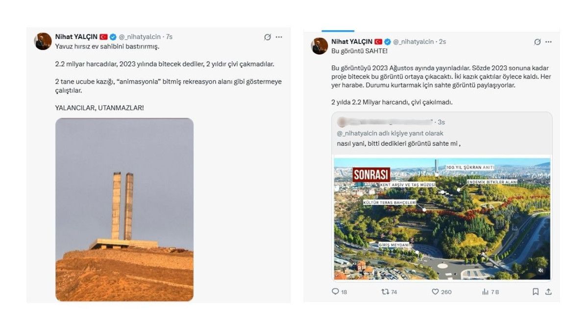Ankara Büyükşehir Belediyesinin (ABB) Hıdırlıktepe Projesi ateş altında. ABB'nin "öncesi-sonrası" videolarına AK Parti Grup Başkanvekili Nihat Yalçın'dan sert tepki geldi. Yalçın, projenin bitmediğini belirterek, "2 yılda 2.2 Milyar harcandı, çivi çakılmadı." iddiasında bulundu.