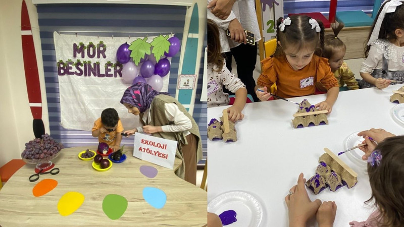 Atölye boyunca çocuklar, “mor üzüm” tasarımıyla kendi küçük üzüm bahçelerini oluşturdu. Bu uygulama sayesinde hem el becerilerini geliştiren hem de üretmenin mutluluğunu yaşayan minikler, doğanın sunduğu çeşitliliği daha yakından gözlemleme fırsatı buldu.
