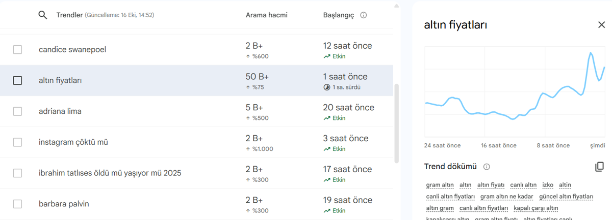 Google Trends verilerine göre, Türkiye’de “gram altın”, “altın fiyatı” ve “ons altın” aramaları son üç ayda en yüksek seviyelerine ulaştı. Uzmanlara göre bu artış, yatırımcıların güvenli liman arayışının dijital ortama da yansıdığını gösteriyor.