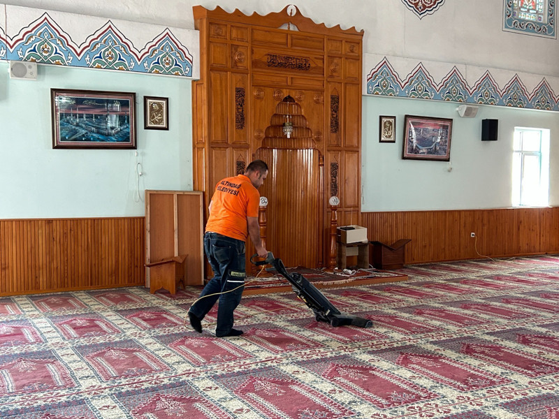 Belediye temizlik ekipleri, vatandaşların bayram boyunca daha sağlıklı ve hijyenik koşullarda ibadet edebilmesi amacıyla camileri baştan sona temizledi.