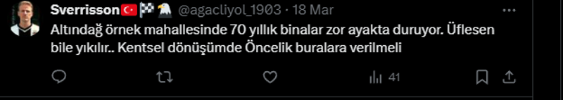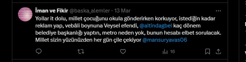 Ankara'nın merkezi ilçelerinden biri olan Altındağ'da vatandaşlar belediye yönetiminden şikayetçi. Son bir ayda Altındağ Belediye Başkanı Veysel Tiryaki'nin sosyal medya hesaplarından yaptığı paylaşımların altına yapılan yorumlar, ilçenin çözülmemiş sorunlarını gözler önüne seriyor.