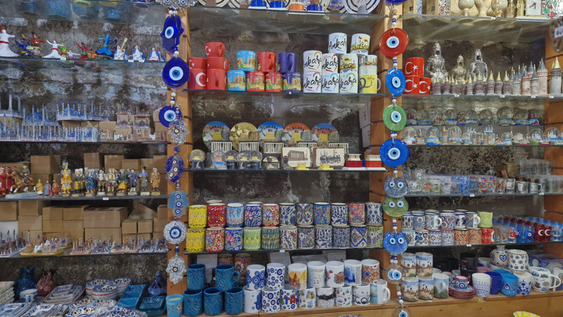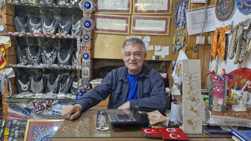 “Turistlere yönelik olarak burada, Türkiye’nin şiirleri ve motifleri gibi ürünler satılıyor. Kilim modelli cüzdanlar, çantalar ve nazar boncukları gibi otantik ürünlerimiz var. Ayrıca Türkiye bayraklı kupalar ve Ankara temalı kupalar da satıyoruz. Ben genellikle otantik takılar satıyorum, onlar da ilgi görüyor. Bu tarz malzemeler, turistlere hitap ediyor ve belli bir estetik yakaladığı için her zaman talep görüyor. Bayram geldiği için işler biraz daha açıldı. İnsanlar burayı ihmal etmiş. Ankara Kalesi etrafı yeni yeni canlanıyor çünkü Ankara’nın böyle tarihi bir mekânı yok. Burada farklı bir güzellik var. İnsanlar bu otantik yere gelerek güzel vakit geçiriyor ve sanki o dönemdeymiş gibi yaşıyor.”