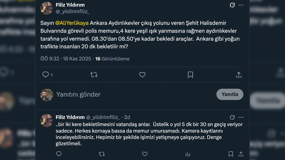Yıldırım'ın paylaşımına göre araçlar 08.30 ile 08.50 arasında aynı noktada beklemek zorunda kaldı. Yıldırım, Ankara gibi yoğun trafiğe sahip bir kentte sürücülerin 20 dakika boyunca gereksiz şekilde tutulmasının kabul edilemez olduğunu belirterek kamera kayıtlarının incelenmesini talep etti.