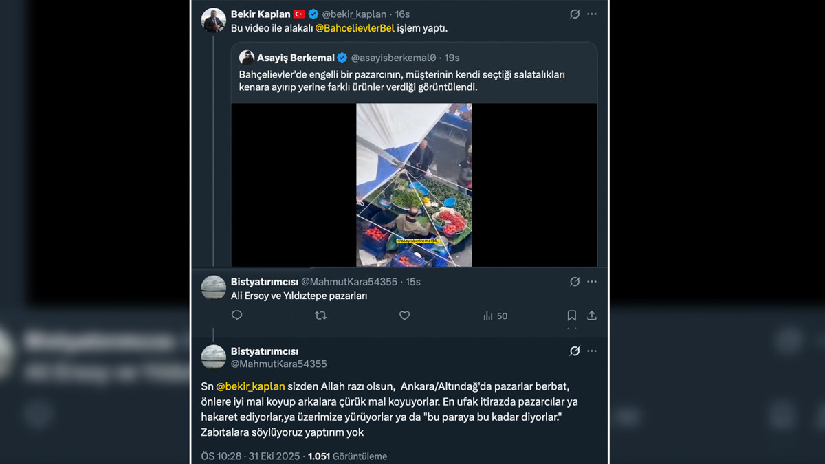 Söz konusu paylaşım, Ticaret Bakanlığı Basın Danışmanı Bekir Kaplan’ın X hesabına da etiketlenerek paylaşıldı. Kaplan, İstanbul'daki Bahçelievler Belediyesinin kısa süre önce bir pazarcının müşteriye farklı ürün verdiği anlara ilişkin görüntülerle ilgili işlem yaptığını hatırlatmıştı. Kaplan'ın bu paylaşımına yorum yazan Altındağ sakini, bölgedeki pazarların da denetime tabi tutulmasını istedi.