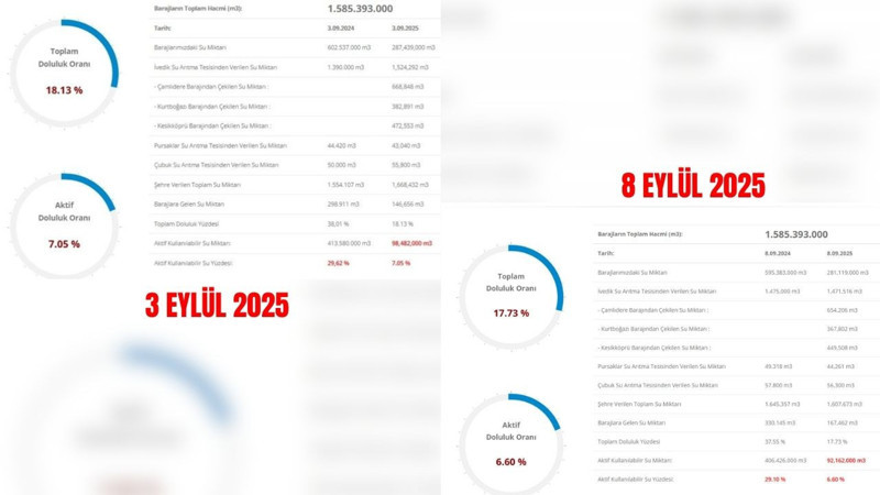 Kentte barajların toplam hacmi 1,585 milyar metreküp olmasına rağmen mevcut su miktarı yalnızca 281 milyon metreküp seviyesinde bulunuyor. Bu durum, yağışlara rağmen barajlardaki doluluk oranlarının düşmeye devam ettiğini gözler önüne seriyor.