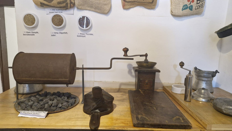 Müzenin girişinde yer alan küçük ama dikkat çekici hediyelik eşya bölümü, kahve tutkunlarını daha ilk adımda karşılıyor. Bir kat yukarı çıkıldığında, Abdülmecid döneminden kalma gümüş işlemeli fincanlar göz kamaştırıyor. En üst katta ise kahve kültürünün derin izlerini taşıyan özel bir salon bulunuyor. Bu salonda Osmanlı’ya kahvenin gelişinden itibaren kullanılan kavurma tavaları, el değirmenleri ve farklı dönem ile coğrafyalara ait cezve formları gibi onlarca eşsiz parça sergileniyor. Cezvelerdeki işçilik ve kullanılan malzemeler, dönemlerin ustalık izlerini taşırken; kahve sunumlarında kullanılan materyaller ve ‘kahve yancıları’ da bu zengin kültürel mirası tamamlıyor.