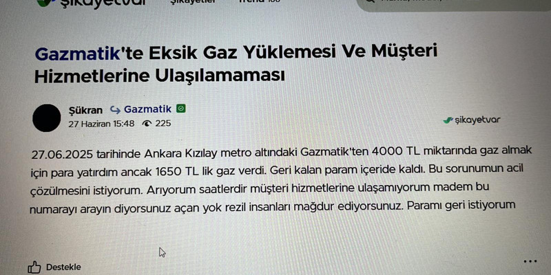 27 Haziran 2025 tarihinde yaşanan bir olay, sorunun boyutunu bir kez daha gözler önüne serdi. Kızılay Metro çıkışındaki Gazmatik cihazına 4 bin TL yatıran bir vatandaş, sadece bin 650 TL’lik doğalgaz alabildiğini belirtti. Geri kalan tutarın cihaza sıkıştığını ifade eden vatandaş, müşteri hizmetlerine ulaşamadığını söyledi. Tepkisini ise şu sözlerle dile getirdi: “Madem bu numarayı arayın diyorsunuz, neden açan yok? İnsanları mağdur ediyorsunuz. Paramı geri istiyorum.”