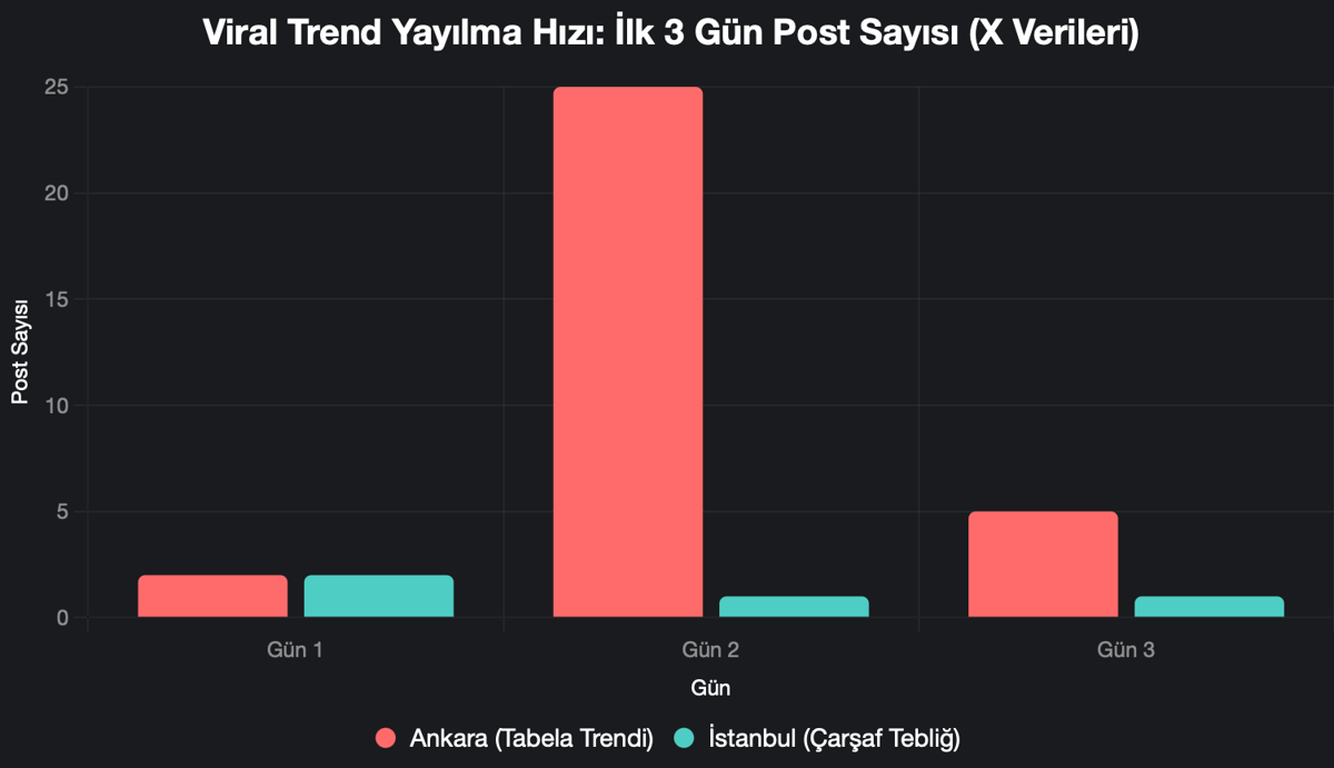 X platformundaki 30 gönderilik veri setine göre Ankara trendi ilk üç günde 32 post’la zirveye ulaştı (günde ortalama 10’dan fazla paylaşım). İstanbul ise aynı sürede yalnızca 4 post’la sınırlı kaldı. İzlenme hızında da fark dikkat çekici: Ankara ilk 24 saatte 2 milyon izlenmeye ulaşırken, İstanbul’un toplamı 700 binde kaldı.