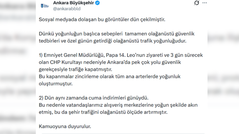 "Emniyet Genel Müdürlüğü, Papa 14. Leo’nun ziyareti ve 3 gün sürecek CHP Kurultayı nedeniyle Ankara’da pek çok yolu güvenlik gerekçesiyle trafiğe kapatmıştır. Bu kapanmalar zincirleme olarak tüm ana arterlerde yoğunluk oluşturmuştur. Vatandaşlarımızın yaşadığı mağduriyetin sebebi, alınan bu olağanüstü güvenlik tedbirleridir."