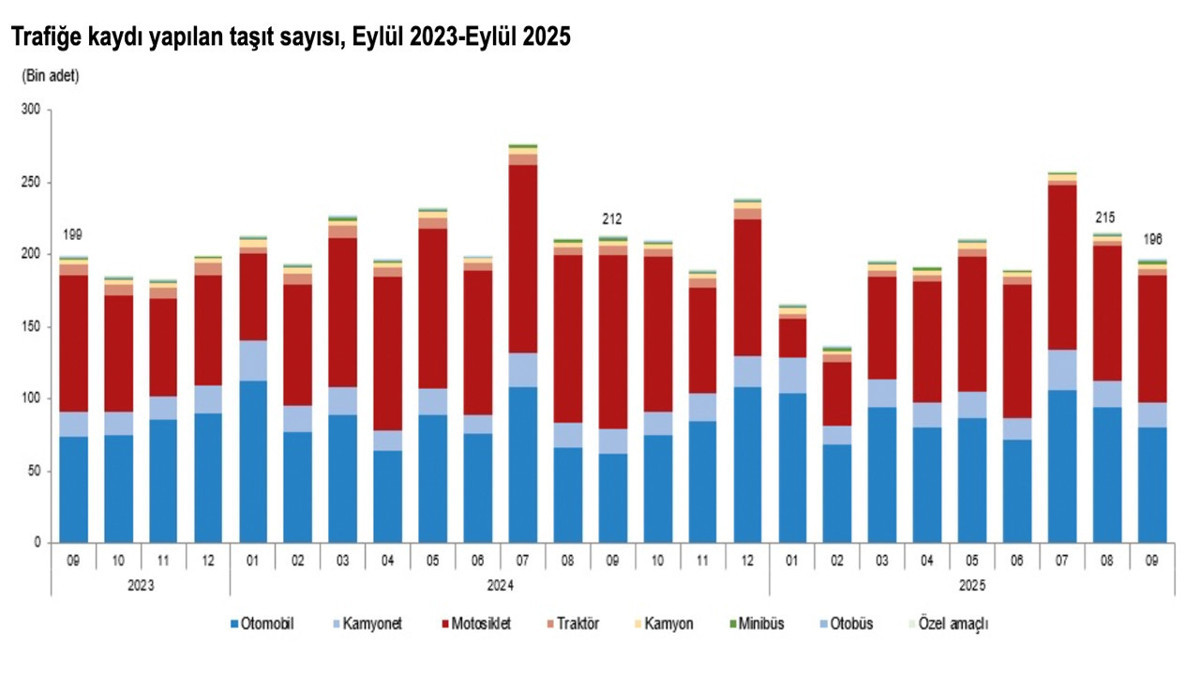 Türkiye'de eylül ayında kaydı yapılan araçların yüzde 45,3’ü motosiklet, yüzde 40,9’u otomobil oldu. Kamyonet, traktör, kamyon, minibüs ve otobüs gibi diğer araç türlerinin oranı ise yüzde 13,8 olarak kaydedildi. Aylık bazda bakıldığında, Eylül’de trafiğe kayıt yaptıran araç sayısı Ağustos’a göre yüzde 8,7 geriledi.