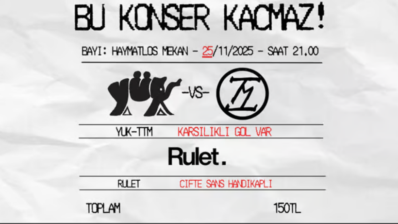 25 Kasım Salı akşamı saat 21'de Haymatlos Mekan, Ankara müzik sahnesinin yükselen üç önemli grubunu ağırlayacak iddialı bir konsere ev sahipliği yapıyor. "Bu konser kaçmaz!" sloganıyla duyurulan gecede, Ankara çıkışlı Rulet, Yük ve TTM grupları, sınırsız bir rekabetin ve yeraltı müziğinin kaotik atmosferini sahneye taşıyacak. Kendi besteledikleri şarkıların yanı sıra sevilen derlemeleri de seslendirecek olan gruplar, Haymatlos’un loş ışıkları altında "herkesin kafasının oldukça karışık" olduğu enerjik bir müzik ziyafeti sunmaya hazırlanıyor. Bu gece, Ankara yeraltı müziğinin nabzını tutmak ve üç grubun sahnedeki çekişmesine tanıklık etmek isteyenler için kaçırılmayacak bir fırsat sunuyor.