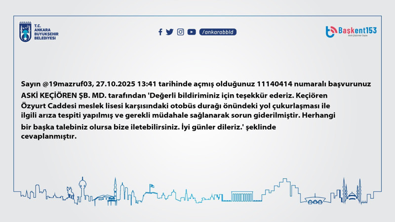 Ankaralıların kent yaşamını doğrudan etkileyen sorunları sosyal medya üzerinden dile getirmesi ve ABB'nin bu geri bildirimlere gösterdiği hassasiyet, yerel yönetimin vatandaş odaklı çalışma anlayışının önemli bir göstergesi olarak öne çıkıyor.