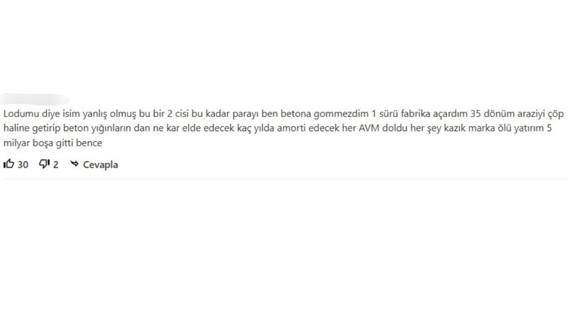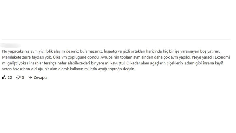 Birçok vatandaş, dev bütçenin yanlış bir yatırıma aktarıldığını savundu. Yorumlarda “Bu kadar parayı betona gömmek yerine fabrikalar açılsaydı istihdam sağlanırdı. Her yer AVM doldu, çoğu boş, bu yatırım ölü yatırım olacak.” ifadeleri dikkat çekti.