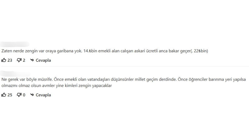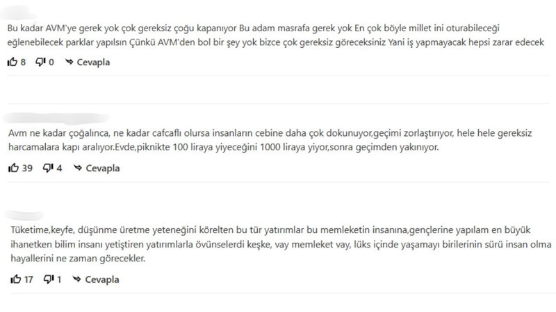 Tepkilerde sosyal sorunlara da vurgu yapıldı: “Emekli geçinemiyor, öğrenciler barınacak yer bulamıyor. Önce halka faydalı projeler yapılsın. AVM’ler sadece belli zümreleri zengin ediyor.”