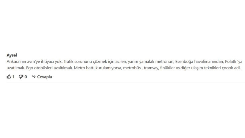 Bir diğer yorum ise kent ulaşımına dikkat çekti: “Ankara’nın AVM’ye değil, metro ve ulaşım yatırımlarına ihtiyacı var. Esenboğa’dan Polatlı’ya kadar uzanacak bir metro hattı yapılmalı.”