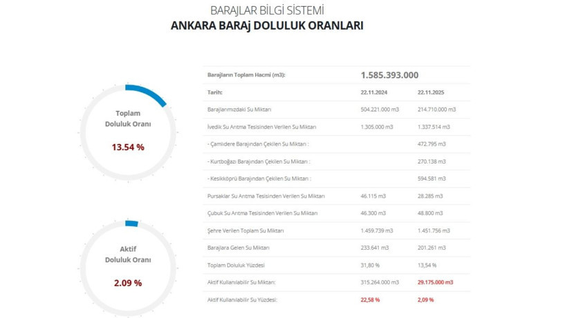 Ankara Su ve Kanalizasyon İdaresi (ASKİ) Baraj Doluluk Oranları Bilgi Sistemi verilerine göre, 22 Kasım 2025 tarihi itibarıyla barajlardaki toplam doluluk oranı yüzde 13.54, aktif kullanılabilir su miktarı ise yalnızca yüzde 2.09 olarak ölçüldü. Geçen yıla (22.11.2024) kıyasla su miktarında 290 milyon metreküpün üzerinde ciddi bir düşüş yaşanması, her damlanın değerini artırdı.