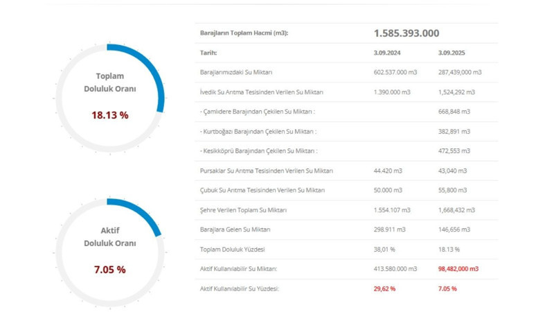 Barajlara gelen su miktarı 2024 yılına kıyasla ciddi oranda azaldı. 2024’te bu miktar 298 bin 911 m³ iken, 2025’te 146 bin 656 m³ seviyesine düştü. Özellikle Temmuz ve Ağustos aylarında gelen yağış miktarının düşük olması, baraj doluluklarının kritik seviyelere düşmesinde etkili oldu.