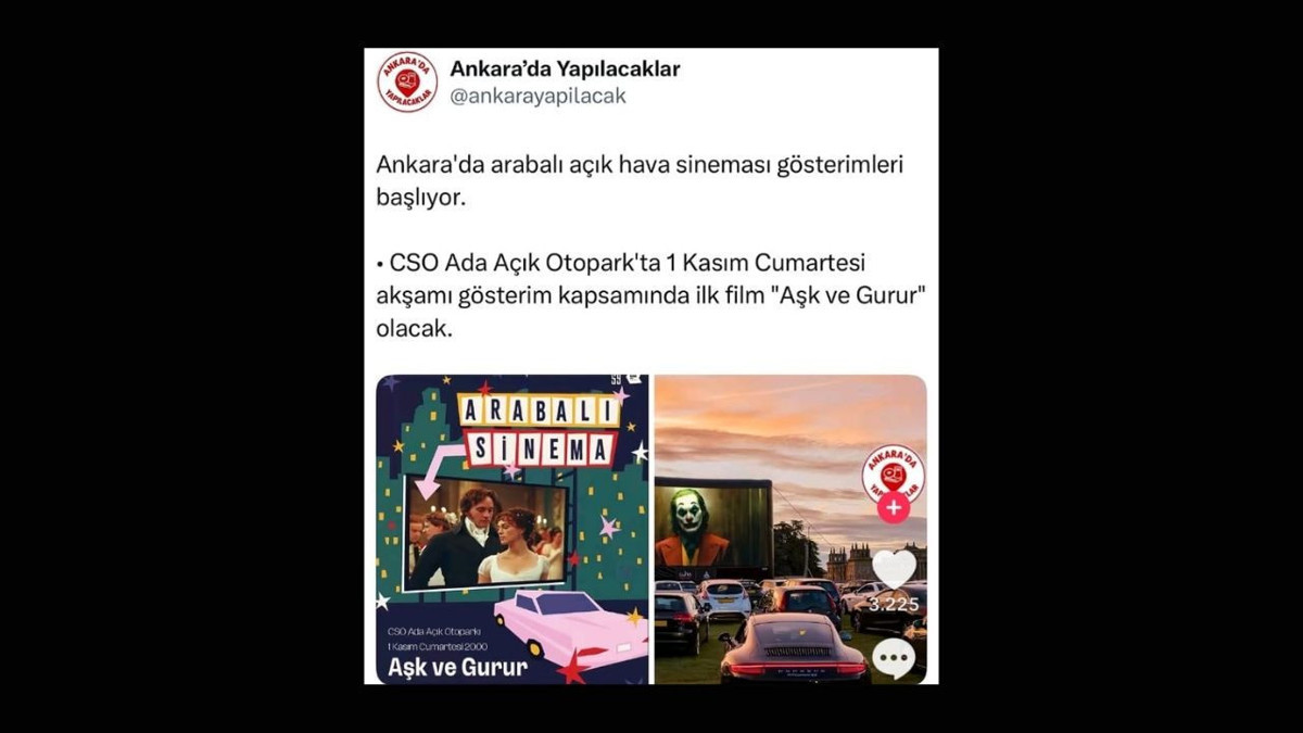 CSO Ada Ankara, kültür ve sanat etkinliklerini açık hava atmosferiyle buluşturmayı sürdürüyor. Yeni başlayan “Arabalı Sinema Geceleri” konseptiyle, Ankaralılara yıldızların altında film izleme keyfi sunulacak. Etkinliğin ilk filmi, dünya çapında milyonlarca izleyiciye ulaşan “Aşk ve Gurur” olacak.