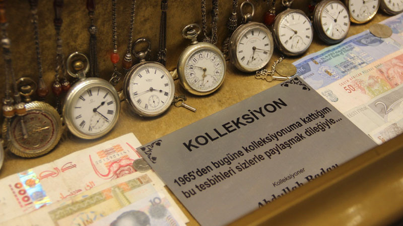 Bunların aslında bir pazarı vardır “antika pazarı” diye ayda bir olur Türkiye’nin her tarafından satıcı ve alıcılar bu pazarda buluşur. Buranın dışında ayrıca tespih ve saat yapan ustalar vardır onlardan alırım, bir de çantacı dediğimiz kişiler vardır bu tür değerli şeyleri ustalardan alır meraklısına satar bunları buralardan temin ettim. Bunun bir piyasası var. En önemlilerinden kehribar, fildişi, ahşap, inci, katalin gibi bu değerli koleksiyonu 65 senedir biriktiriyorum. Halen de araştırır, bulur ve alırım. Bu değerli koleksiyonu da saklamak yerine bu şekilde teşhir ederek herkesin de görmesini sağladım. Bu vitrin içinde aynı zamanda çok eski paralarda mevcut. Sadece bizim değil farklı ülkelerinde eski paraları bu koleksiyonda yerini aldı” ifadelerini kullandı.