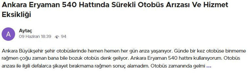 Eryaman 540 numaralı otobüs hattını kullanan başka bir vatandaş ise her gün otobüs arızasıyla karşılaştığını belirtti. “Defalarca şikayet bırakmama rağmen sonuç alamadım. Otobüs ya arızalı geliyor ya da hiç gelmiyor.” sözleriyle ulaşım sorununu gözler önüne serdi.