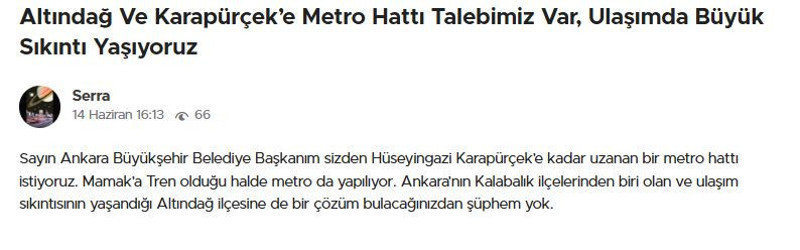 Altındağ ve Karapürçek’ten bir vatandaş, bölgenin yoğun nüfusuna rağmen metro ulaşımının olmamasından yakındı. Hüseyingazi’ye kadar uzanan bir metro hattı talebini yineledi.