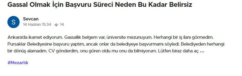 Üniversite mezunu ve gassallık belgesine sahip olduğunu belirten bir kadın, iş başvurusuna dönüş alamadığını, sürecin son derece belirsiz olduğunu ifade etti. Başka bir şikayetçi ise tatil kampı başvuru sisteminin hatalı çalıştığını, saatlerce başvuru yapamadığını belirtti.