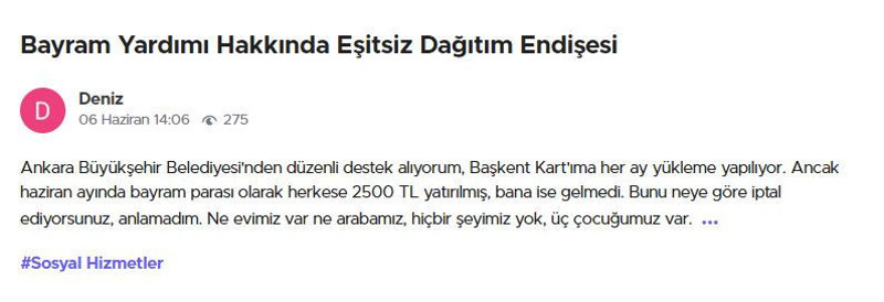 Bayram yardımlarında eşitsizlik yaşandığını belirten bazı vatandaşlar ise Başkent Kart sisteminde bazı hak sahiplerinin dışlandığını iddia etti. “Üç çocuğum var, hiçbir gelirim yok ama bana bayram yardımı yapılmadı.” diyen bir anne, belediyenin yardım politikalarını eleştirdi.