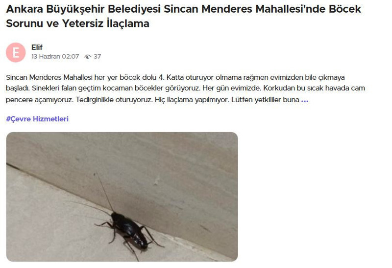 Sincan Menderes Mahallesi’nde ikamet eden bir vatandaş, evinde dahi kocaman böceklerle karşılaştığını, ilaçlama yapılmadığı için camlarını bile açamaz hale geldiklerini söyledi. Altındağ Aydınlıkevler’de yol kapanması, Savun Sokak’ta hijyen sorunları, gece yapılan yol çalışmaları ve sokak hayvanlarına barınak talebi gibi birçok çevre temelli şikayet de gündemde yer alıyor.