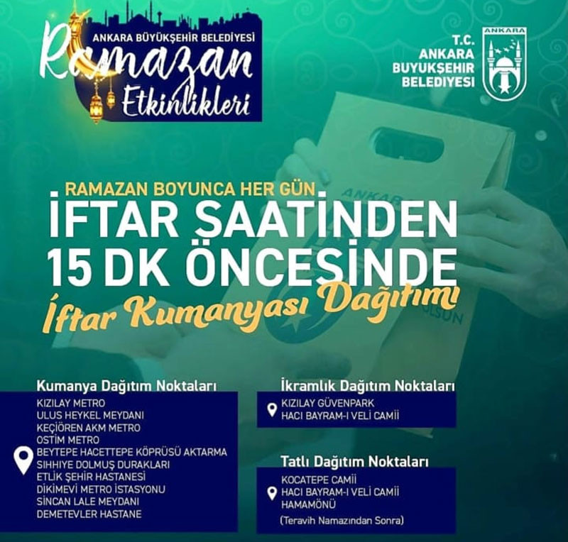 Ankara Büyükşehir Belediyesi, ramazan ayı boyunca iftar kumanyası, ikramlık ve tatlı dağıtımı yapılacak noktaları açıkladı.