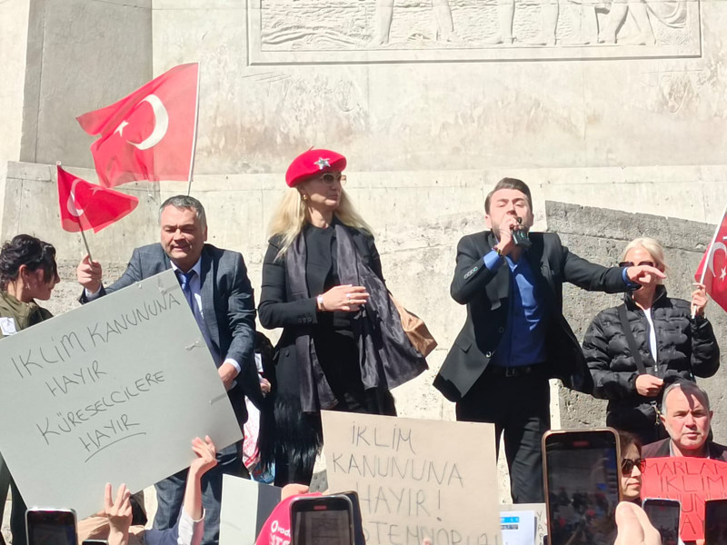 Ulus'taki Atatürk Heykeli önünde bir araya gelen grup, İklim Kanunu'nu protesto etti. Eyleme ünlü şarkıcı Tuğba Özay, yazar, gazeteci Ali Osman Önder, Yeniden Refah Partisi Milletvekili Mehmet Aşıla ve vatandaşlar katıldı.