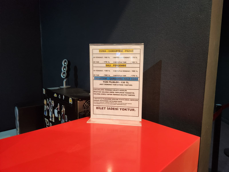 Hafta içi ve hafta sonu değişen bilet fiyatları; cuma-cumartesi-pazar günleri daha yüksek seyrederek öğrenciler için 170, tam bilet için ise 180 liradan satılıyor. Halk günü tam ve öğrenci ayrımı yapılmadan 130 liradan satılan biletler, haftanın kalan günlerinde film türüne ve gösterim formatına göre farklı fiyattan satılıyor.
