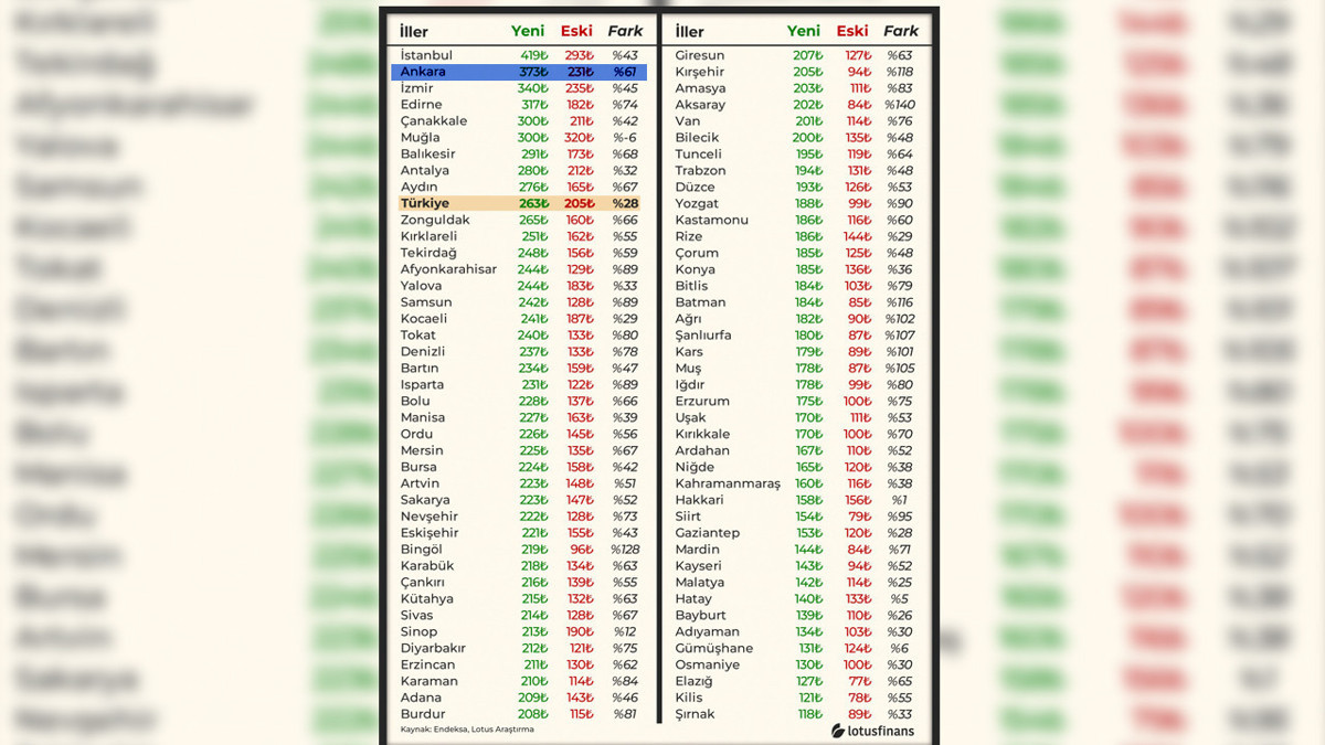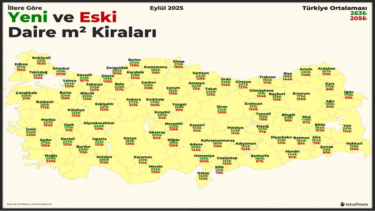 Lotus Finans’ın eylül 2025 tarihli analizine göre Ankara, Türkiye genelinde yeni ve eski konutlar arasındaki kira farkının en belirgin olduğu büyükşehirlerden biri oldu. Başkentte yeni konutlarda ortalama kira 373 TL/metrekare iken, 16 yaş ve üzeri eski binalarda bu rakam 231 TL/metrekare seviyesinde. Böylece yeni daireler, eski konutlara göre yaklaşık yüzde 62 oranla daha yüksek rakamlarla kiralanıyor.