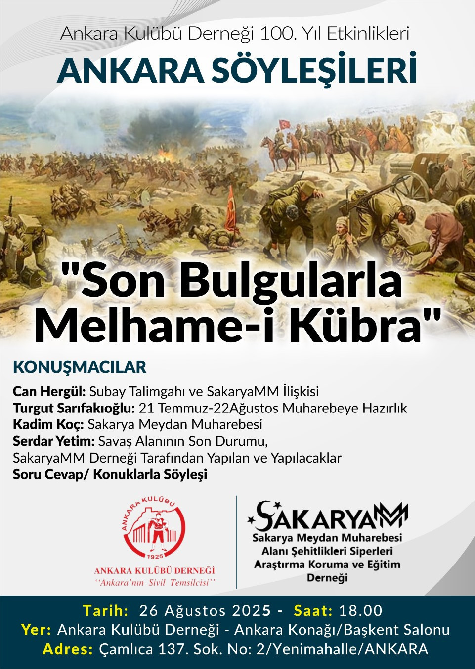 Ankara Kulübü Derneği’nin 100. yıl etkinlikleri kapsamında düzenlenen “Ankara Söyleşileri” serisi, 26 Ağustos 2025 Salı günü saat 18.00’de Ankara Konağı/Başkent Salonu’nda gerçekleştirilecek “Son Bulgularla Melhame-i Kübra” başlıklı programla devam edecek. Konuşmacılar arasında Can Hergül, Turgut Sarıfakioğlu, Kadim Koç ve Serdar Yetim yer alacak. Söyleşide Sakarya Meydan Muharebesi’nin hazırlık sürecinden savaş alanlarının günümüzdeki durumuna kadar pek çok başlık ele alınacak.
