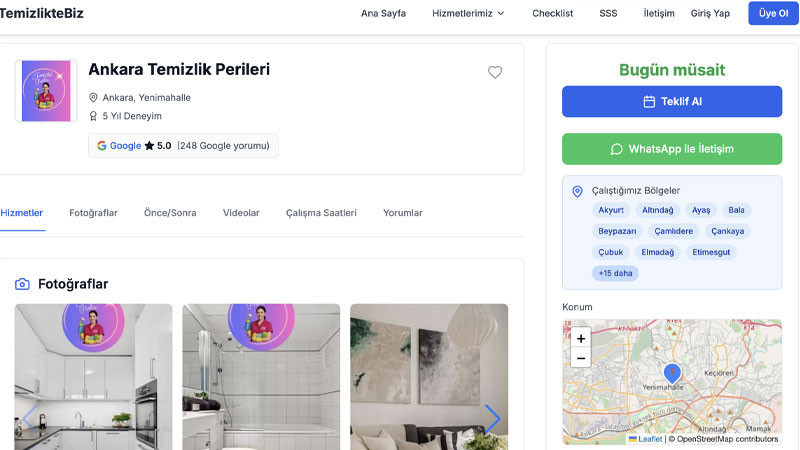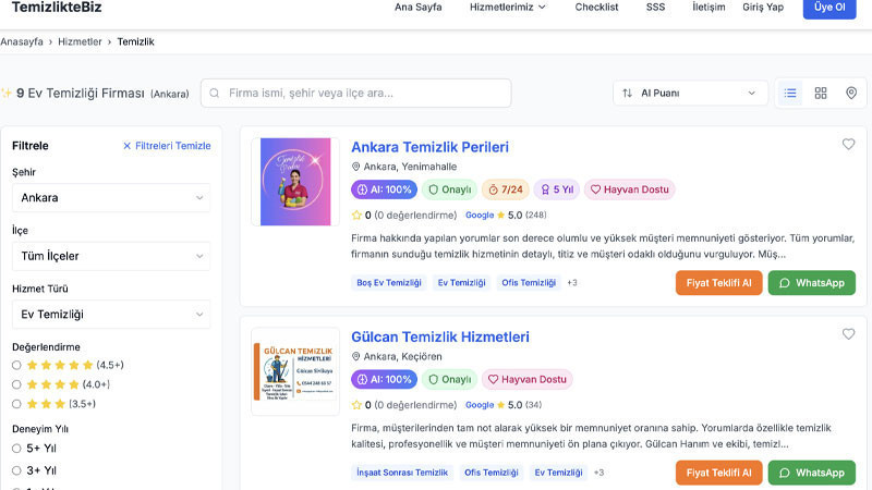 Ankara’da Çankaya, Keçiören, Yenimahalle, Etimesgut gibi birçok ilçede faaliyet gösteren firmalar, TemizlikteBiz.com üzerinden kullanıcılarla buluşuyor. İstanbul’da ise Anadolu ve Avrupa Yakası’nda onlarca güvenilir temizlik şirketi platformda yer alıyor.