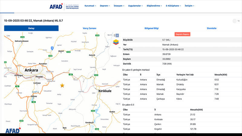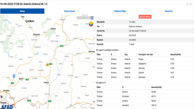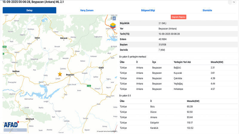Kayıtlara göre hepsi yerin 7 kilometre derinliğinde olmak üzere Mamak’ta 0,7 büyüklüğünde, aynı şekilde Beypazarı’nda 2.1 büyüklüğünde ve Kalecik’te 1.2 büyüklüğünde deprem meydana geldi. Kalecik’teki deprem dün yaşanırken, Mamak ve Beypazarı’ndaki depremler ise bugün meydana geldi.