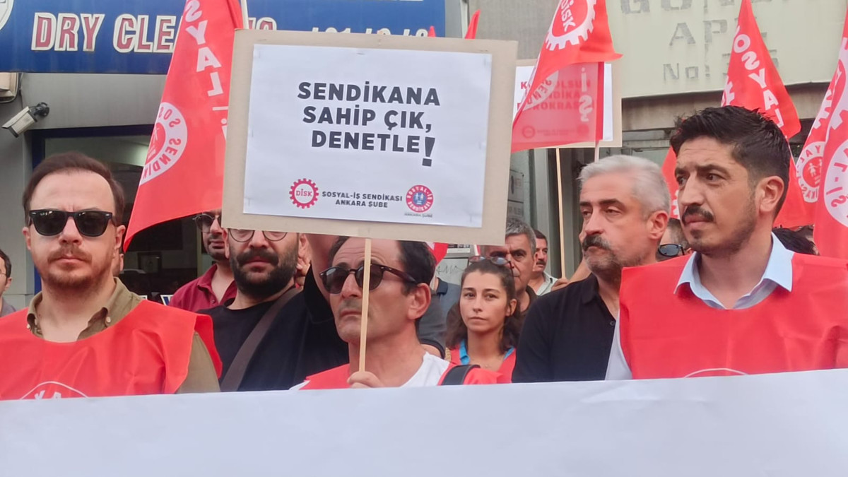 Ankara’da Sosyal-İş üyeleri, şube başkanı Aydın Kaplan’ın görevden uzaklaştırılmasına tepki göstererek genel merkez önünde açıklama yaptı.