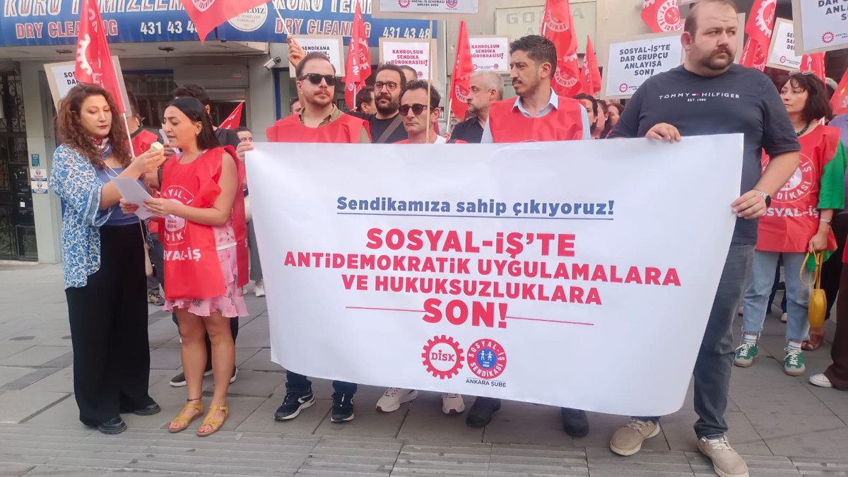 Sosyal-İş Sendikası Genel Merkezi'nin dar kadrocu politikalarına ve antidemokratik uygulamalarına karşı sendika içindeki muhalefet, bugün sokağa taştı. Ankara Şubesi'nin çağrısıyla toplanan sendika üyeleri ve yöneticileri, genel merkezin İzmir ve Ankara şubelerine yönelik aldığı kararları protesto etmek amacıyla bir yürüyüş ve oturma eylemi başlattı.