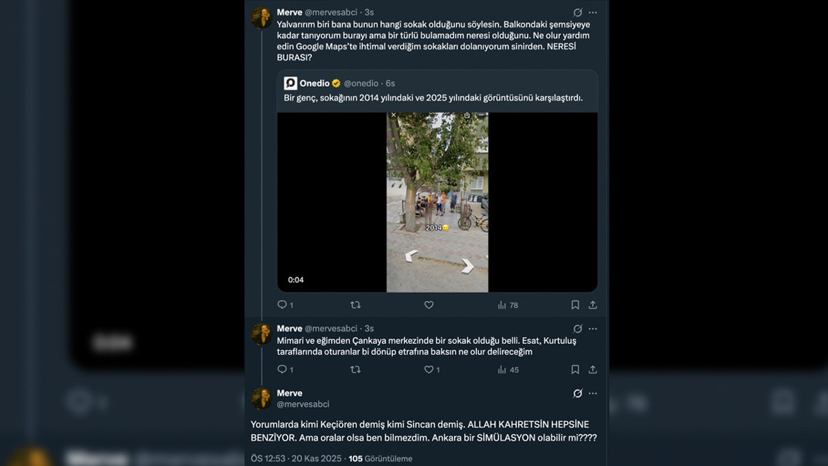 Videoyu alıntılayarak hangi sokak olduğunu bulmaya çalışan Merve Sabcı adlı kullanıcı, “Balkondaki şemsiyeye kadar tanıyorum, ama yerini asla çıkaramıyorum” diyerek platformdaki diğer kullanıcılardan yardım istedi. Sabcı’nın mesajı, dakikalar içinde Ankaralıları “benim sokak”, “komşu mahalle”, “orası Esat”, “Keçiören gibi duruyor”, “Sincan kokusu var” şeklinde tahmin yürütmeye sürükledi.