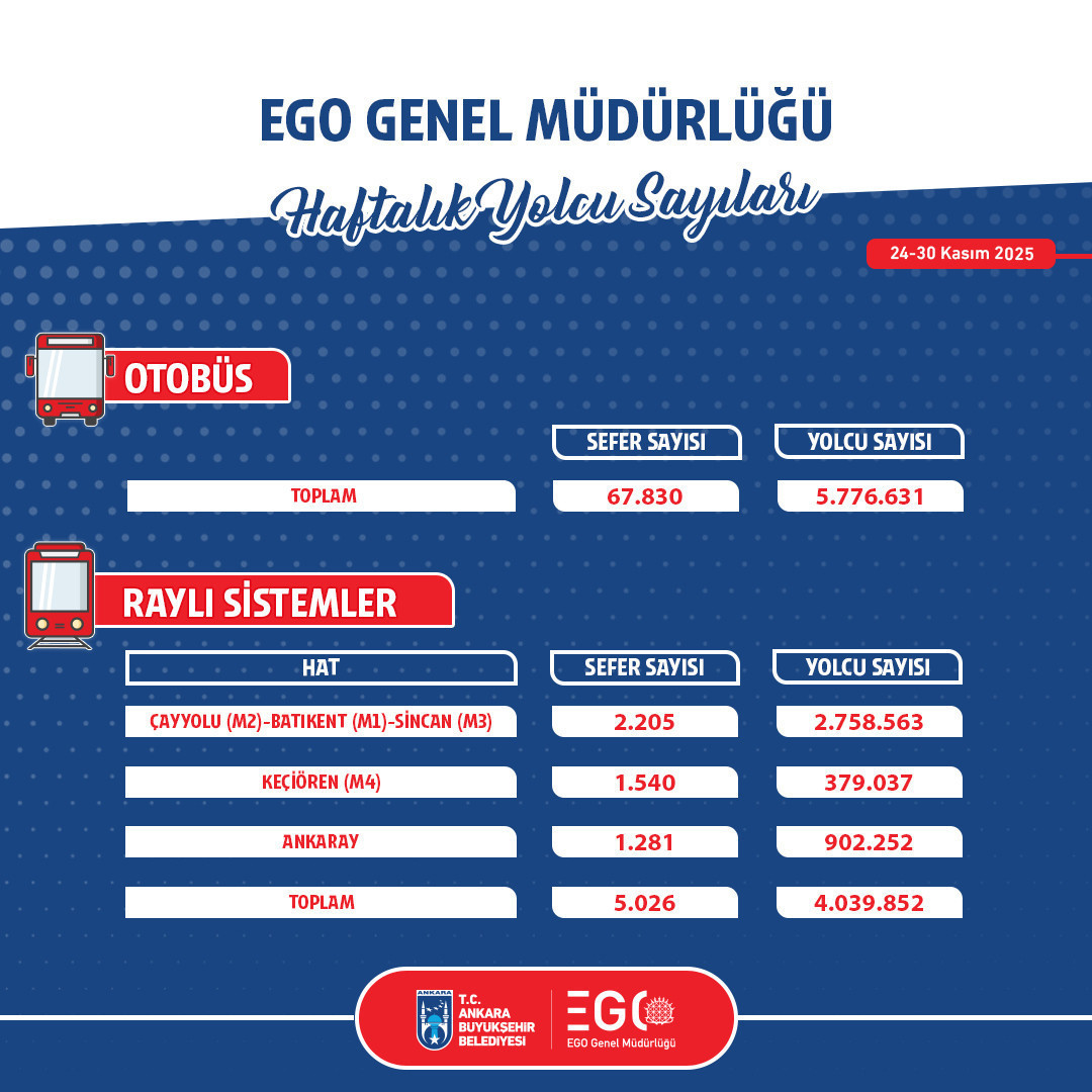 EGO Genel Müdürlüğü, 24–30 Kasım 2025 dönemine ait haftalık toplu taşıma istatistiklerini kamuoyuyla paylaştı. Açıklanan verilere göre, otobüs ve raylı sistemlerde toplamda yaklaşık 9 milyon 800 bin yolcu taşındı.