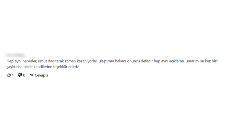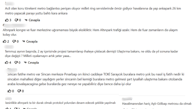 Esenboğa Havalimanı Metrosu Projesine dair öne çıkan yorumlarda en sık tekrarlanan ifade şu oldu: “Açıklama değil, kazma sesi duymak istiyoruz.”
