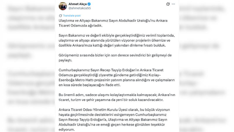 Akça, “Cumhurbaşkanımız Sayın Recep Tayyip Erdoğan’ın ziyareti sırasında gündeme getirdiğimiz Kızılay–Esenboğa Metro Hattı projesinin yatırım planına alınması Ankara için önemli bir gelişmedir. Bu proje sadece ulaşımı değil, ticareti ve şehir yaşamını da dönüştürecektir.” dedi.