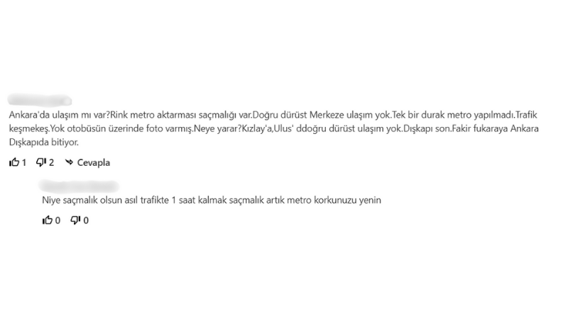 Özellikle merkez ulaşımı ve metro aktarmaları üzerinden gelen eleştiriler dikkat çekti. “Ankara’da ulaşım mı var? Kızılay’a, Ulus’a doğru düzgün ulaşım yok. Dışkapı’da bitiyor hatlar.” diyen vatandaş, ABB’nin önceliğinin yeni araçlardan ziyade mevcut sistemin geliştirilmesi olması gerektiğini savundu.