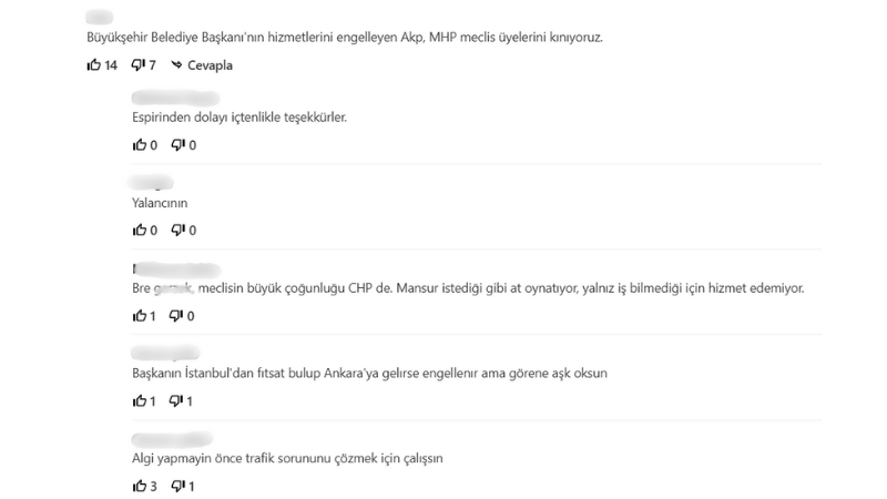 Tepkiler arasında siyasi değerlendirmeler de yer aldı. Bir grup kullanıcı, ABB’nin hizmetlerinin belediye meclisindeki muhalefet tarafından engellendiğini savunarak yönetimi desteklerken, bir başka grup ise “Mansur Yavaş algı yapıyor, hizmet üretemiyor.” görüşünü dile getirdi.